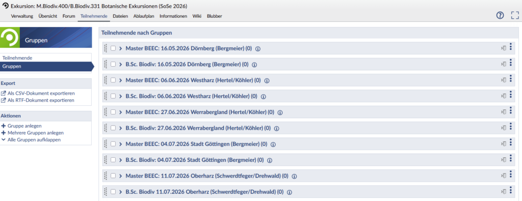 Bitte beachten Sie: es gibt je Exkursionsziel zwei Gruppen (siehe Abbildung: Master BEEC / B.Sc. Biodiv), tragen Sie sich nur entsprechend Ihres Studiengangs für die Exkursionstermine ein.